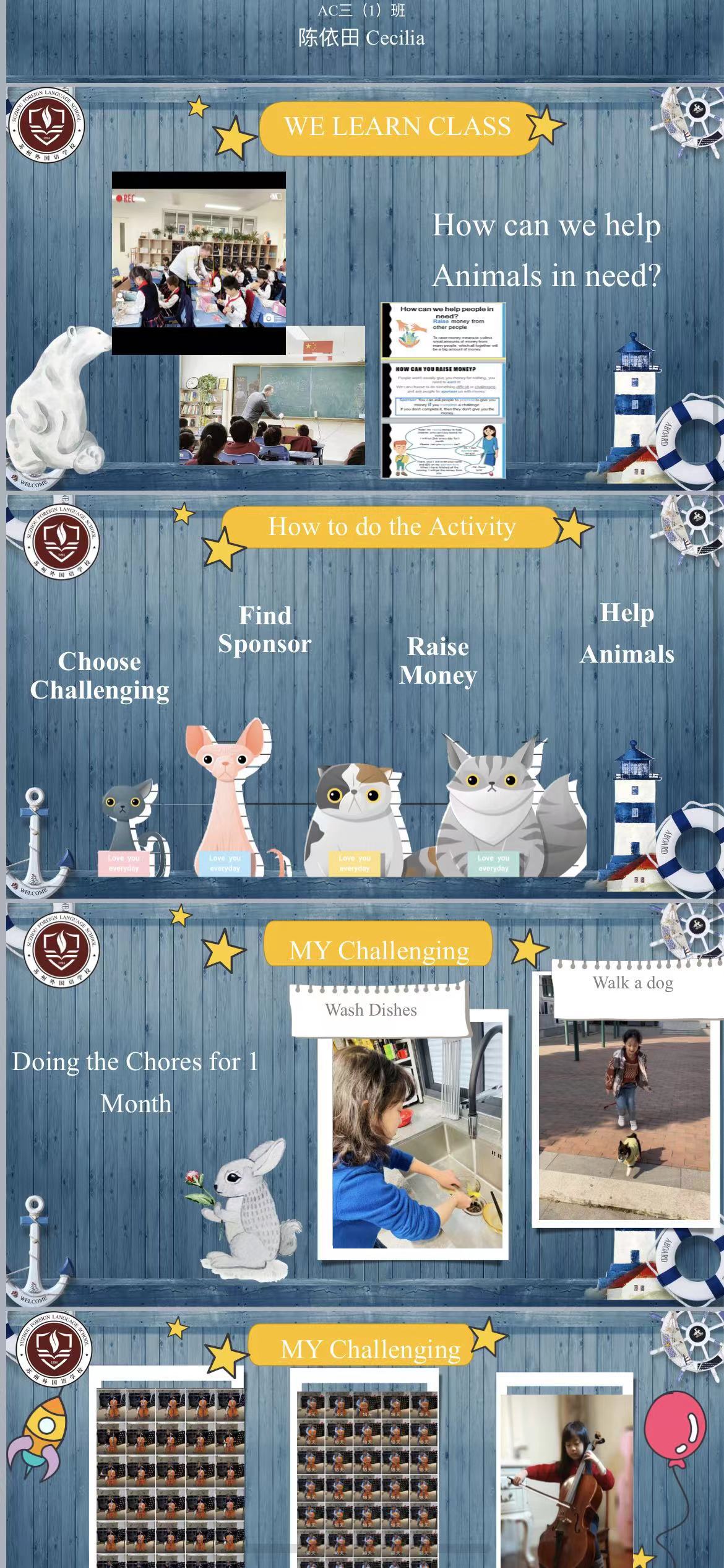 Last term we had the class“How can we help Animals in need?”, we can choose to do something difficult or challenging, and ask people to sponsor us with money. Then we can help people in need.
