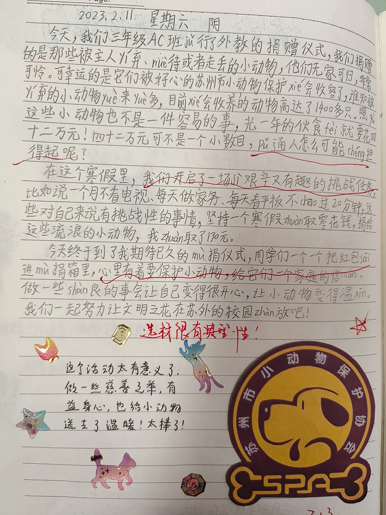 通过孩子一个假期的坚持努力,两个AC班共募集公益款项一万一千余元。2月10日上午,在二楼报告厅举行了一个隆盛的捐赠仪式,苏州“小动保”机构派专人来接收了这笔公益款项,并向学校授予“ 慈善学校”的荣誉证书。很多孩子们在“小动保”爱心人士的介绍中受到感染,认识到动物保护的重要性,“可以不爱,但不要伤害”这句话深深刻在孩子们心里。还有很多孩子表示,要去领养流浪猫和狗,让他们也拥有一个温暖的家。