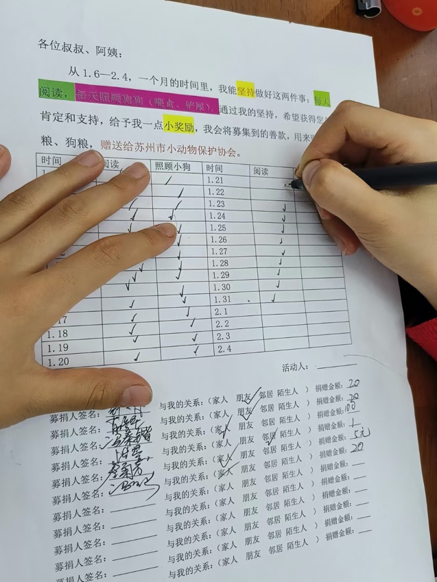 孩子们利用假期时间,或通过自己的劳动如做洗碗、打扫卫生等家务活,或增加看书时间,或每天运动30分钟,或少食垃圾食品等形式,以坚持的行动力找父母、亲人、陌生人募集善款。当孩子们选择好劳动形式后需要坚持一整个月,才能得到相应报酬。之后将募集到的善款,捐赠给苏州市小动物保护协会(以下简称“小动保”),用于购买猫粮、狗粮。