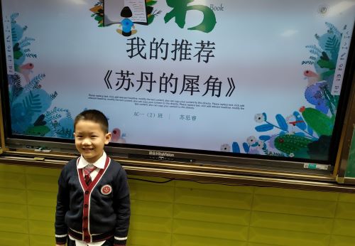 此次主题活动以孩子们的阅读推荐为主。瞧,他们推荐的书目多种多样,有童话故事、中国神话、科学百科、趣味解谜......每个人推荐的角度也各不相同,有的是从作者介绍,有的从故事内容,还有的从人物形象来进行分享,每个人的眼睛中都闪烁着对推荐书目的好奇,甚至想一睹为快。其中苏思睿同学与大家分享了《苏丹的犀角》这本书,通过绘声绘色的故事讲述,仿佛把大家也带到了场景中,最后他还呼吁大家一起保护珍稀动物。邹翌晗同学向大家推荐了《牙齿大街的新鲜事》,他结合书中插图,给大家展示了他最喜欢的角色,并且还畅谈了读完后的感受,也号召同学们坚持刷牙,保护牙齿。