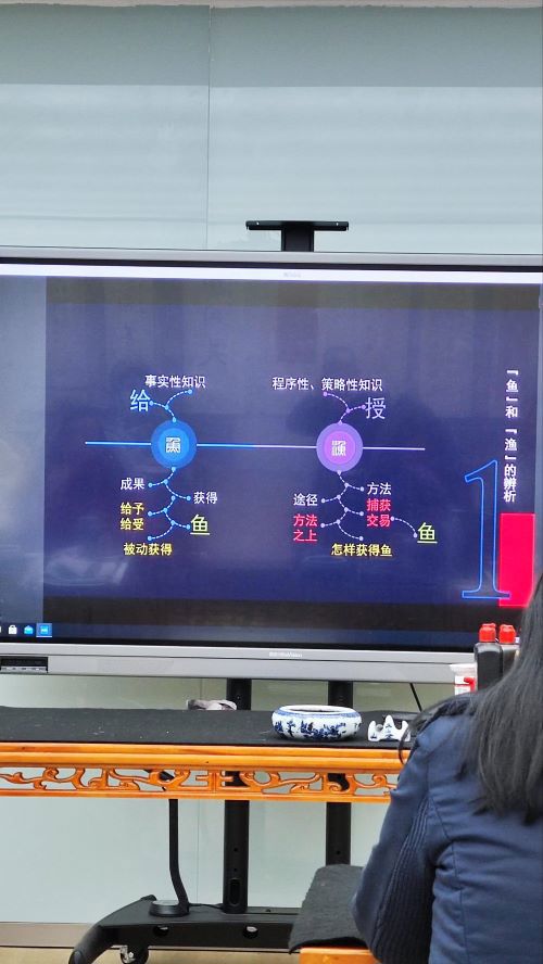 沈兰老师此次培训的内容为美术单元教学,其中包括五个大的方面:1.“鱼”和“渔”的辨析;2.“大”的判断与定位;3.生成 融合 坐标;4.面向“论题”的设定;5.智慧与迁移的锚定。在“鱼”和“渔”的辨析中沈兰老师展开了精彩的论点阐释,“鱼”是给予,“渔”是教授,“鱼”是被动获得,而“渔”是思考怎样获得。首先是对“鱼”和“渔”的辨析,授人以鱼不如授人以渔,即“给予一条鱼不如教会他捕鱼的方法”。给予更加简单,而教会别人如何捕鱼就需要艺术教育者花费更多的心思,所以在探索大单元的过程可以说是更加艰难。简笔画所呈现出来的鱼的形象和真实具有立体感的鱼所呈现出来的对比图是让我的思想发生改变与理解的转折点,简单的学习技法和真实的理解现实,以及弄懂如何绘画,怎样绘画,是值得教育者深思的。所以可以得出总结,大观念的内核是“渔”是对“渔”的深度理解,并形成具有自我认知的创新思想,是以理解为先的教育。通过理解的维度、解释、释义、应用、洞察、移情、自知进行思考,在某种程度上讲,教学设计和教学策略就是建立一个帮助学生理解知识的有效途径。