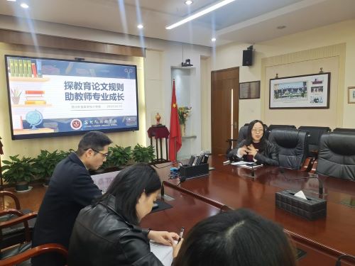 接着是蒋琴老师与青年教师们一起分享有关论文市区级教科研学习平台,还有学校企业微信中“乐享苏外”的使用路径,帮助各位年轻老师们灵活正确地使用好网络学习平台,更好规划自己的职业前进方向。