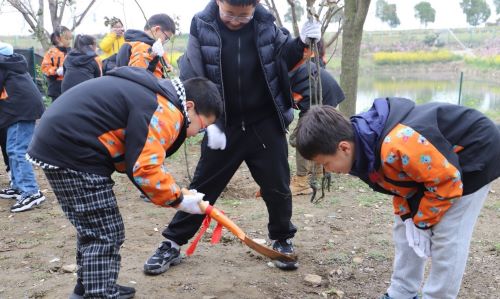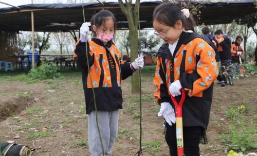 万事俱备,只欠动手啦!小朋友们把在课本上《邓小平爷爷植树》中的知识运用到实践中,按照植树步骤把小树苗安全移到坑内,保证它们能顺利成长。不知不觉中就能感受到汗水已经慢慢爬上额头,但是小朋友们仍然一步一步小心翼翼埋头苦干着。在自己的努力下看着弱小的树苗在春风里迎风挺直腰杆,一半在土里吸收养分,一半在风里飞扬,是一件特别有成就感的事,小朋友们累并快乐着。