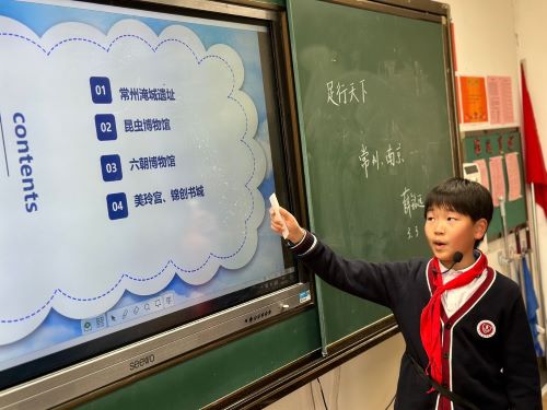 第二个来进行分享的是薛铭远同学,他介绍的是去年暑假里去常州和南京旅行的收获。薛同学重点介绍了以下几个景点:常州淹城遗址、昆虫博物馆、六朝博物馆、美龄宫和锦创书城。常州淹城博物馆,他从一张航拍图中向大家介绍了淹城特别的构成方式,用百灵公主的故事,介绍了三墩这个景点的由来。紫金山昆虫博物馆,薛同学重点介绍了螳螂拟态和锹甲,也引出了很多昆虫的知识,还加入了自己养昆虫的故事,很有意思。关于六朝博物馆,则重点介绍了六朝中重要科技人物的成就,比如大家熟知的祖冲之、葛洪等,还联系了我们语文书上的内容。另外,还讲了很多朝代更替的知识,内容非常丰富。美龄宫的介绍,薛同学也分享了一张航拍图,让我们感受到了这座宫殿就像是一条珠链上的夜明珠,非常漂亮。薛铭远同学的分享讲了20多分钟,全部脱稿,内容丰富精彩,可以看出他平时对历史非常喜欢,知识面很广,是一次很棒的演讲。