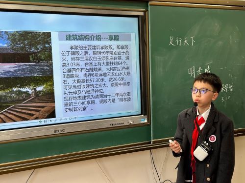 梁景智同学,他介绍的是明孝陵,分为明孝陵简介、明孝陵建筑结构介绍和明孝陵的历史文化价值三个方面进行了讲解。明孝陵是明朝开国皇帝朱元璋与马皇后的合葬陵墓,2003年被列入了世界遗产名录,是5A级景区。小梁同学重点介绍的内容是明孝陵的结构,从神道石像到文武方门,从神功圣德碑到治隆唐宋碑,从享殿到方城明楼再到宝顶等,基本上把明孝陵中一些重要的建筑结构特点都进行了介绍。在讲到治隆唐宋碑的时候,介绍这个碑是由当时的“江宁织造”郎中曹寅刻立,并提问曹寅是谁?有同学知道,介绍是《红楼梦》作者曹雪芹的爷爷。我也顺便介绍了一下曹雪芹所写的贾府生活其实是他自己童年生活的缩影。小梁同学的分享知识面很广,让大家对古代皇家陵墓的构造有了一个初步的了解,过程中仪态大方,侃侃而谈,很好!