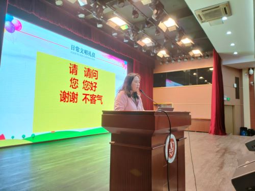 三月的春风吹来了文明之花,校园春色盎然,美丽的校园里应有儒雅的言行举止。而一个人的综合素养应该在他孩童时期就已经养成。爱因斯坦曾经说过,什么是教育?把在学校里学到的所有东西全部忘光了之后留下来的东西才叫教育。三月二十三日晚课,一年级组全体师生集聚报告厅,利用晚课时间,抓住孩子们受教最佳时期开展集会,从多方面对孩童进行教育。集会由年级组长杨竹娟主持,她从教室收纳整理、餐厅文明就餐、问好懂得尊重、懂得爱护公物、安全时刻铭记等多方面交流。
