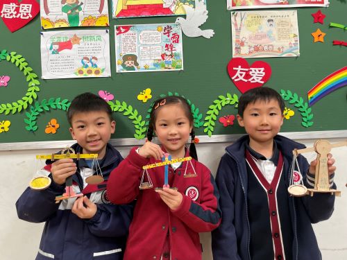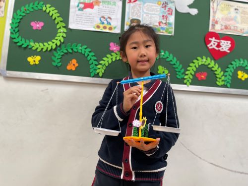 阿基米德曾经说过:“给我一个支点,我可以撬动地球。”根据杠杆原理制成的天平秤,激发学生热爱科学、探索科学、运用科学的兴趣,AC一(1)班举行了DIY天平秀科学活动。
