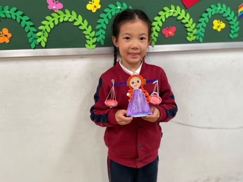 这是王翊宸和爷爷一起完成的木质天平,她把这个天平想象成一位身穿礼服的小女孩,天平的底座是小女孩的脚,支撑柱是小女孩修长的身体,并给她穿上了一件华美绚丽的紫礼服,圆圆的刻度盘描绘上小女孩精致的五官,笑容甜美,再用扭扭棒卷出大波浪,一头橙色的长发让小女孩更显活泼可爱,最后再在横木两端系好两个托盘,一个漂亮的女孩天平就制作完成啦!