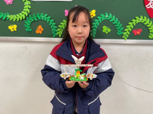 做好天平后,朱维妮在底座上捏出个童话小王国,用色彩鲜艳的超轻粘土装饰成兔子花园,丰收了,小兔子就可以利用天平,收获她的花朵和胡萝卜了。