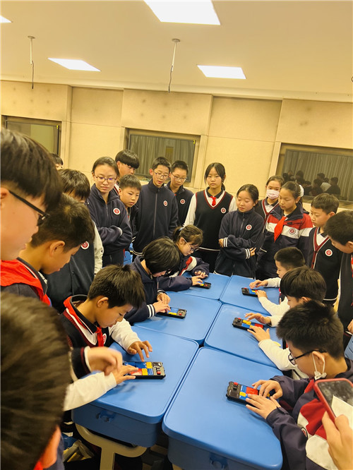 数字华容道的比赛中,小选手们个个胸有成竹、神采飞扬,比赛成绩咬时很紧,最快的是5班的顾洪宇同学,用时14秒,让同学们赞不绝口,现场响起雷鸣般的掌声。几轮比赛结束后,大家意犹未尽,于是又临时增加一场挑战赛,这是几位高手的终极对弈,所有人都屏住了呼吸,时间瞬时而过,仿佛眨眼之间就都还原成功,掌声此起彼伏。