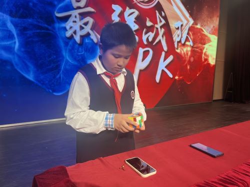 个人赛结束后进行的是班级接力赛,每个班三位选手依次接力还原3个魔方,比赛比平时练习更加考验每位选手的魔方水平和心理素质,五(4)班吴嘉玺表现异常抢眼,在还原第3个魔方时,力压群雄,一举夺得接力赛第一名!