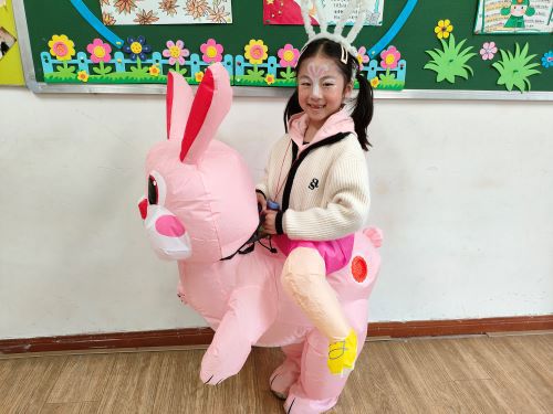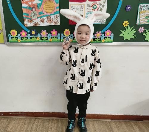 校园的早晨是宁静的,但是却因为一群可爱萌兔子的到来,而变得热闹非凡。小朋友们对此次活动十分期待,早早就换上了自己心仪的兔子服装。他们的兔子装扮各种各样,可爱极了。王艺萌小朋友自己精心挑选了兔子套装,充完气后的造型就像她骑着一只小兔子,令人眼前一亮。陆钱葭怿小朋友挑选了自己最爱的朱迪警官造型,进行装扮,长长的耳朵,短短的尾巴,萌化了许多人的心。许一铭小朋友穿上了全是兔子图案的衬衫,搭配精心化上的兔子妆容,走起路来还蹦蹦跳跳的,宛如一只活泼的小兔子!王悦宁、陈采韵、丁宇尘等小朋友还穿上了兔子的连体衣,化身为了一只只萌萌的小兔子。