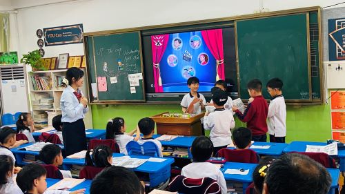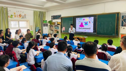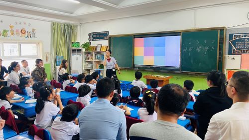 AC一5班除了英语教学外,还开设了法语课程。许老师课前播放了有趣的动物字母歌,让学生跟着视频走进法语课堂。通过观影识物、记忆图片、快速说出消失了的小动物、区域识别猜动物,以及动物转盘等多种有趣的小组竞赛方式,帮助学生巩固记忆学习过的小动物单词和颜色词汇。课堂上,新授了4个新的颜色词汇,学生听老师说颜色快速反应是哪个动物的方式来记忆单词,最后通过句子小火车游戏尝试拼出完整的句型。整节课,每一个学生都很积极活跃,在老师的带领下度过了一节开心的法语课,家长们饶有兴趣被活跃的课堂气氛所感染。