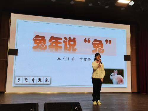 首先上场的是来自五(1)班的卞艾雨同学,兔年说兔,她以“兔”为主题,讲述了历史上”兔“有机智、多福、吉祥的寓意,为大家讲述了“守株待兔“、”狡兔三窟“这两个成语故事的由来,也为大家带来了关于”玉兔“与月亮的美好传说:嫦娥怀抱玉兔,形影飘渺,明月动美之境浮现在我们眼前。