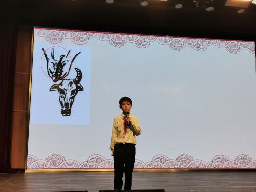 下一个上台演讲的是来自五(4)班的凌承初,他以“解”字的由来和意义为主题,为同学们详细讲述了“解”这个字在不同时期的写法和演变过程,根据甲骨文的字形逐步推测出了“解”字的原义,大家听得津津有味,对“解”字有了更深的了解。