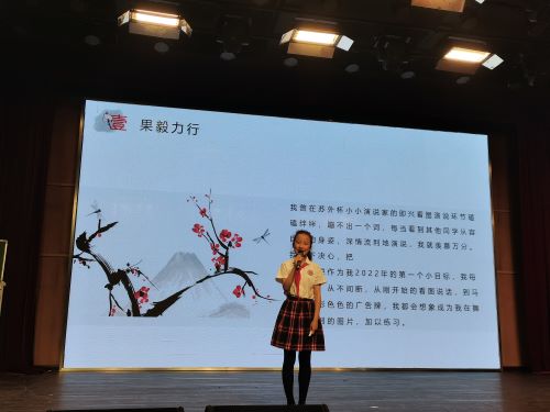 正当大家沉浸其中还没缓过神来,五(2)班的李芝萱同学手握话筒,迈着自信的步伐踏上讲台,她的演讲主题为年度汉字--“行”,讲述了“行”字的演变过程,围绕“果毅力行”、“行胜于言”、“行稳致远 ”、“品行为先”四个核心词语,讲述“行”字给她带来的启发与收获,告诉我们,怀揣梦想时,一定要坚持不懈;有想法时,一定要付之于行动;学习中,需要掌握好自己的节奏;作为一名少先队员,要时刻谨记自己的使命,传递正能量。