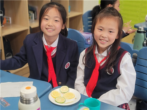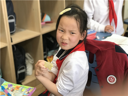 刚上完《画杨桃》,就有好些小朋友向语文老师诉苦:“长这么大,我还没吃过杨桃呢,真想尝尝啊!”第二天,就有小朋友从家里带来了几个大杨桃。小朋友们睁大好奇的眼睛,摸摸、闻闻,“360度”全方位观察了可爱的杨桃。老师再把杨桃切成了漂亮的小星星,开启品尝模式。小朋友们先来一片原味的——好酸,都酸出了表情包了,原来杨桃是这个味道呀!再来一片撒上梅子粉的, 哇!——酸酸甜甜,真好吃呢!