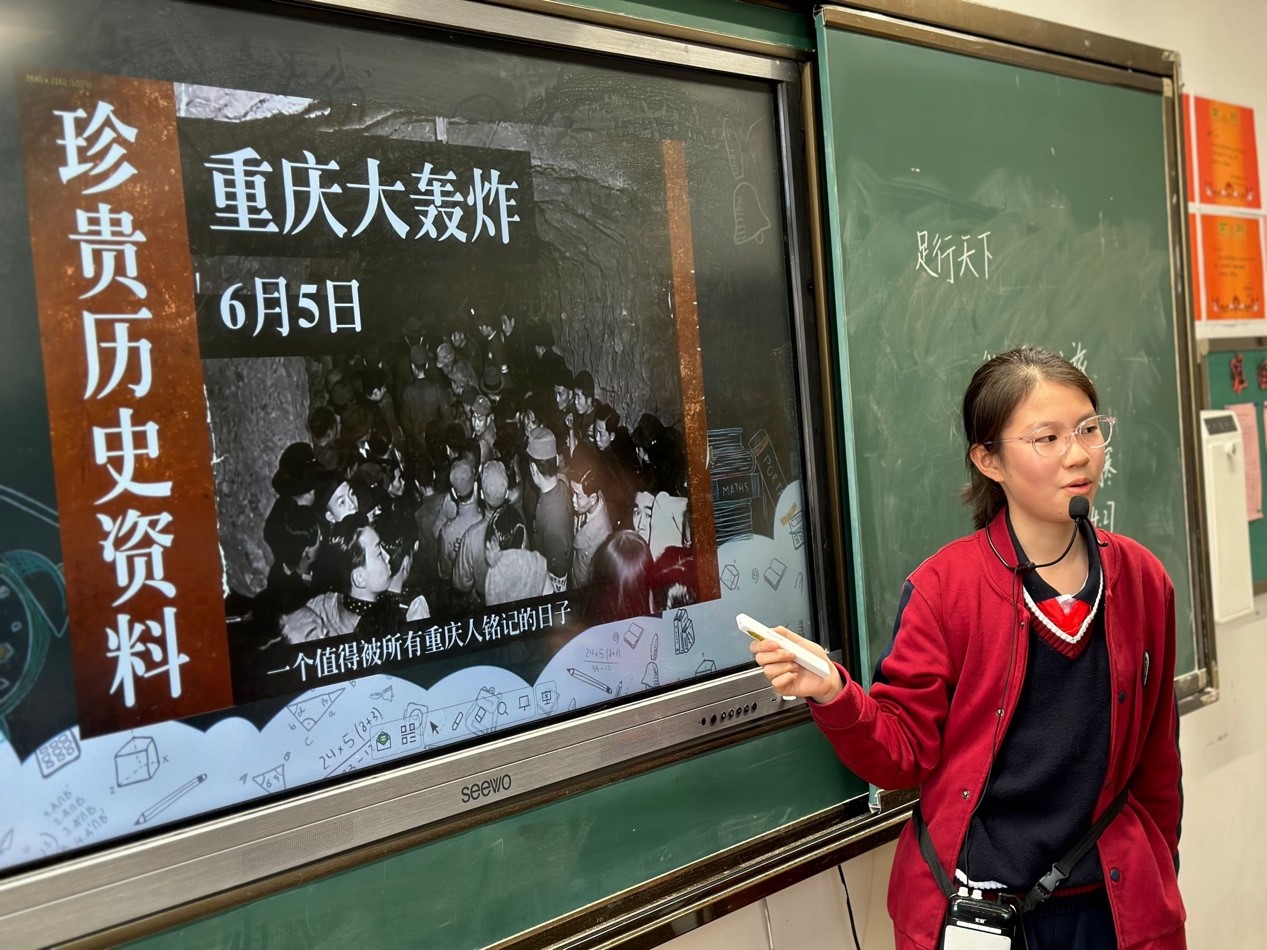 吴阅寒同学分享的是重庆之旅。吴同学的分享没有从行程的时间安排来进行介绍,而是抓住了重庆的几大特色来展开的。首先是山城,特色鲜明,导航都找不到地方。其次是桥都,因为这里河流交汇,所以有各类桥梁4500多座,世所罕见。然后分享了重庆的特色建筑,如洪崖洞,穿楼而过的地铁……接着分享了重庆美食,火锅、串串、冰粉,看得大家垂涎三尺。最后介绍了重庆的防空洞,回到过去,介绍了重庆为什么会有这么多的防空洞,随后又告诉大家,如今的防空洞已经成了大家打卡的特色网红地,有的成了火锅店,有的成了图书馆,还有的成了加油站……吴阅寒的分享,声音响亮,仪态大方,条理清晰,内容生动,内容的组织也非常有特色,尤其是对防空洞的介绍,很新颖!