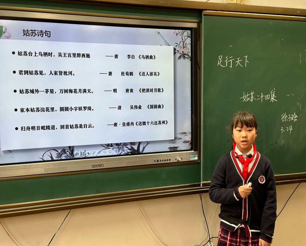 徐子晗同学给大家介绍的是“姑苏二十四集”。这是一个坐落在格林公园中的一条文化街区。一开始,徐子晗给大家分享了这个特色街区名字的由来,原来是以二十四节气的时间演变为理念的。接着,她和大家一起复习了二十四节气歌,具体了解了这24个节气的名字。然后,徐子晗同学用一组照片,让我们了解了这个地方的特色布置,古色古香,设计师将姑苏特色的小桥流水都搬进了这个街区里,利用光影变化,营造出了一种独特的味道。徐子晗同学分享的第二个板块是姑苏诗词。苏州一直是文人墨客最喜欢的地方之一,因此留下了很多诗句,徐同学带着大家一起进行了了解。最后第三个板块,徐同学介绍了这个市集中最具特色的几个地方,有典当行、布庄染坊、特色小吃和萌宠纪。徐子晗同学的介绍,不仅仅在于这个地方本身了,添加了更多的人文气息,增加了诗词介绍,让分享更具文化底蕴,制作的PPT也古色古香,和自己的分享相得益彰!