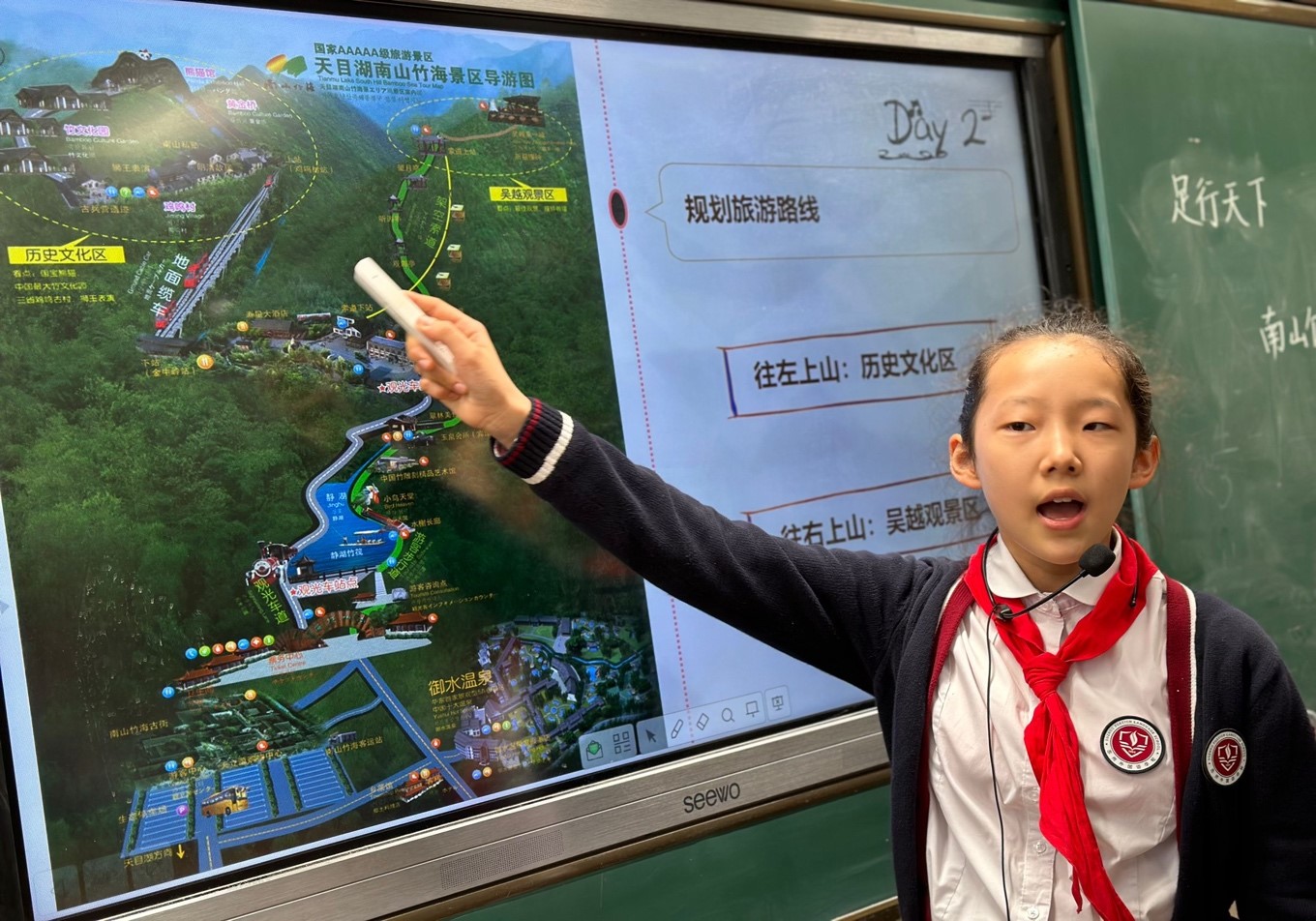 谢秦亦心同学介绍的是南山竹海。南山竹海受到很多文人雅士的推崇,所以,一开始的分享中,心心就吟诵了两位诗人的诗句,他们都表达了对竹海的喜爱之情。第一天的行程,她分享了所住酒店的特色,环境清幽,晚上还有草坪音乐节。行程的第二天,活动非常丰富:介绍了寿星广场上的中华第一寿星雕塑;乘坐缆车感受竹海的自然风光;乘坐地面缆车穿梭竹海亲近自然;参观古村落“鸡鸣村”;参观竹文化园;参观熊猫馆,赏天目湖,品天目湖砂锅大鱼头……每个部分介绍得都十分具体,比如竹文化园里,除了给大家展示了文化园里的竹子艺术品,更是非常细致地讲解了“竹子”背后的文化内涵——可使食无肉,不可居无竹,可见历来中国人对竹子的喜爱,爱它的翠绿挺拔,更爱它身上的风骨和气质。谢秦亦心同学的分享结束后,同学们的掌声非常热烈,都说讲得太好了,她的语言功底非常好,稿子的组织跟她的作文一样,行文流畅,语言优美,讲解的过程非常流利,活泼大气,很棒!
