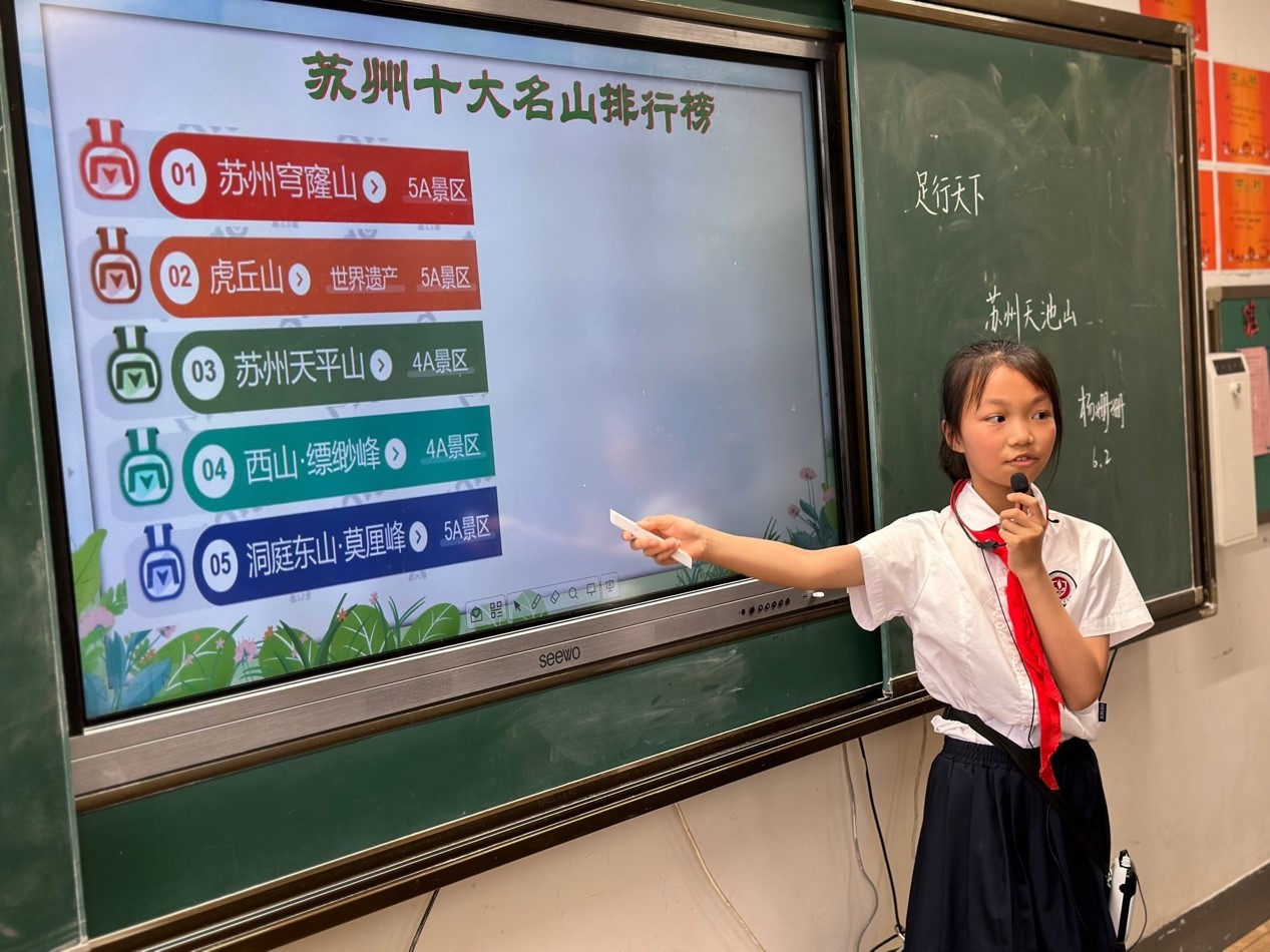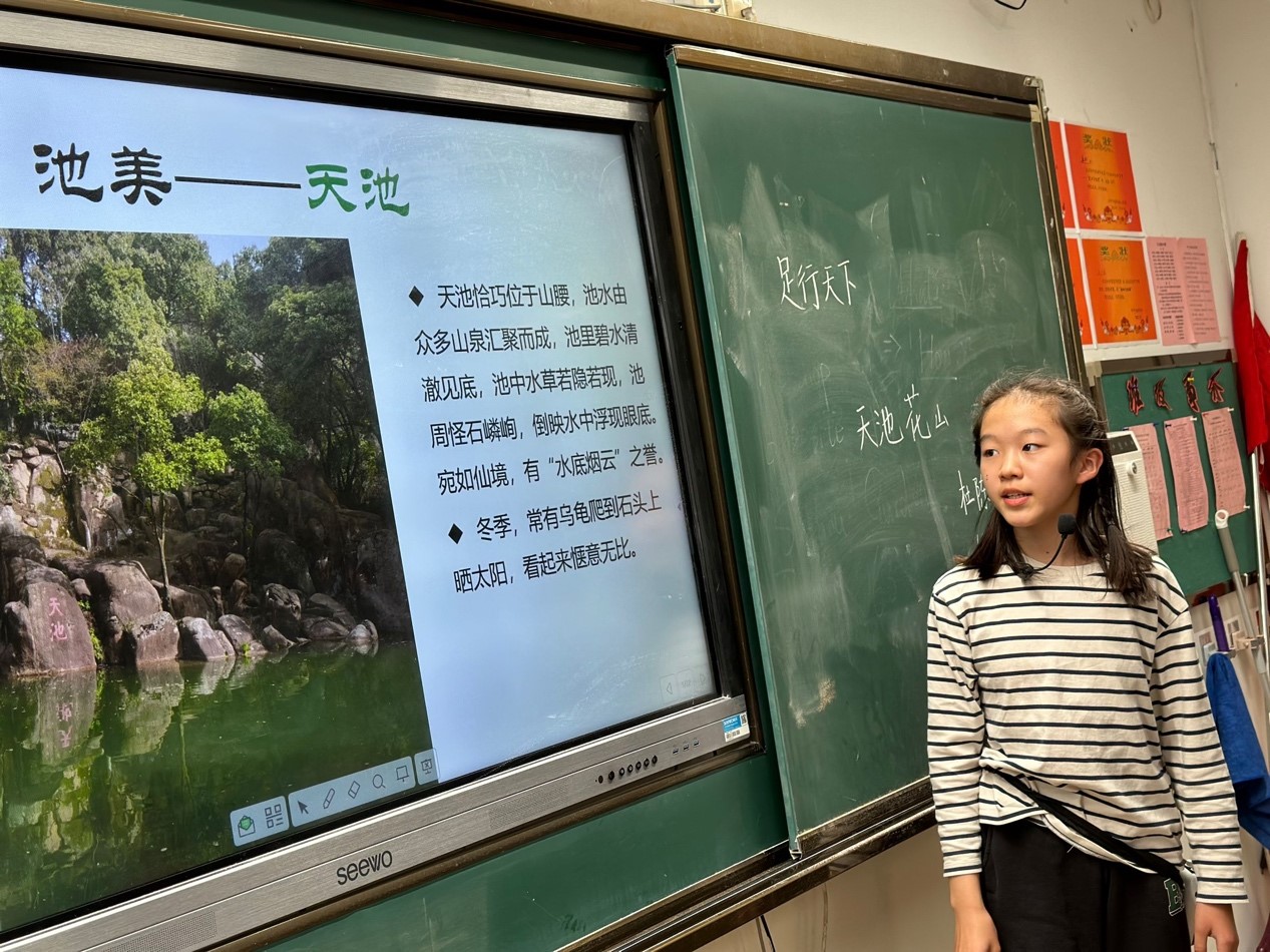 杜陈曦同学介绍的是自己爬山的收获。他们家每个月都是会去爬一座山,到目前为止,已经爬了十几座了,其中天池山花山都是爬的次数比较多的山。首先她简介了天池山风景区的概况,介绍了天池山名字的由来及其主要特点,抓住:境幽、池美、泉甘、石奇、佛灵这几个角度来分享了天池山的景点,比如境幽,介绍了桃花涧,佛灵,介绍了寂鉴寺。花山的介绍,也是先总的简介了景区概况,康熙和乾隆南巡时曾造访花山,留下了很多诗作,御碑亭里就有两位皇帝诗作的石碑。此外,她还介绍了花山上的翠岩遗址、接引大佛、摩崖石刻等。在分享的最后,杜陈曦介绍了在爬山过程中了解到的很多冷知识,同学听得兴致盎然,比如山上有许多有趣的植物,比如:一种叫夏天无的植物,它春天盛开鲜花,到了夏天却整个植物都会枯萎,找不到踪迹。再比如岩石上的白点点原来叫地衣,能分泌地衣酸,腐蚀岩石,促进风化,之后苔藓才能生存。有一种叫乌鸫的鸟类,可以模仿各种鸟的叫声,长得有点像乌鸦,但嘴是黄色的。杜陈曦同学的分享,知识非常丰富,在爬山锻炼身体的同时还能有这么多的收获,真是了不起!