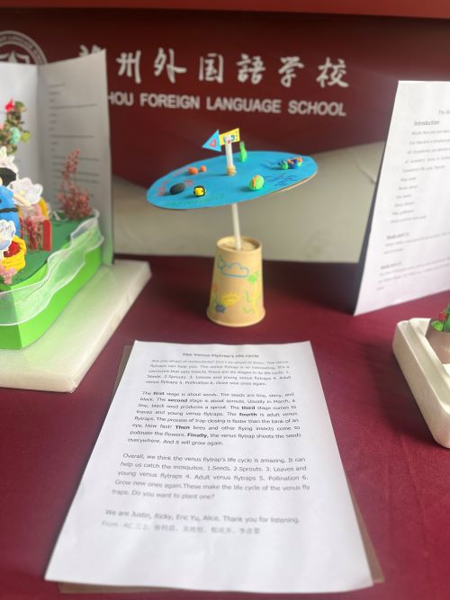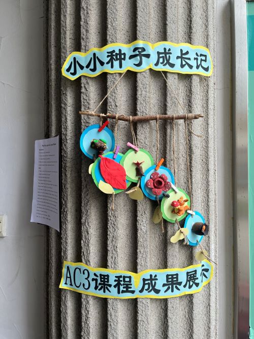 我觉得这次活动太有意思了。我们先是跟着Eric老师学习了植物生长循环,然后我就跟我的组员们一起动手制作plant life cycle手工,在这个过程中,我们遇到了撑柱子立不起来的问题,我们小组通过讨论,尝试,请教老师的方法改良了我们之前的设计方案,并成功用双面胶、牛皮筋等道具固定了起来。---Niki