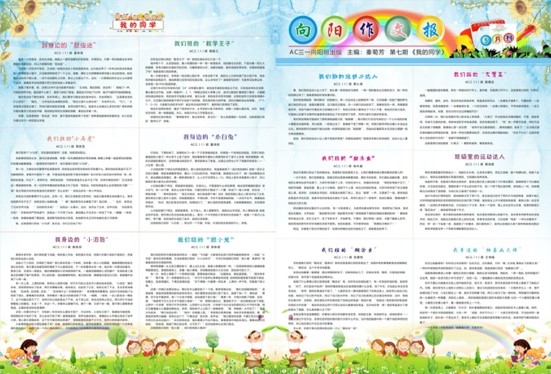 班报,是一个班级文化灵魂的体现。从三年级上学期开始,我从孩子们的习作、日记中挑选佳作,每隔一月便推出一份主题式作文,录入班报《向阳作文报》,从风景篇、人物篇、动物篇、故事篇等,目前已陆续推出14期作文报,让每个用心创作的孩子都体验了一回当“小作家”的快乐。