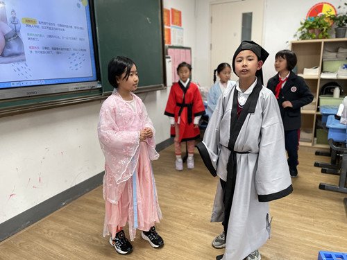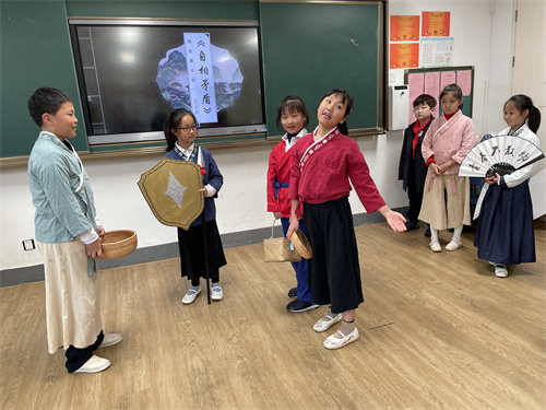国学书上很多精彩的故事家喻户晓,我们三(4)班的苏外娃利用课余时间自编自导,把这些经典的故事搬上了班级的小舞台,故事里的经典人物齐亮相,精彩缤纷呈。邓梓煊和朱伊尧两个小组各自表演的两个版本的《滥竽充数》里不懂装懂的南郭先生,个性鲜明的齐泯王都给我们留下了深刻的印象,班级里时而欢声笑语萦耳,时而矛盾激化惊心。陈昕阳同学小组带来的的经典故事《自相矛盾》。舞台上热闹的街市此起彼伏的叫卖声让大家留下了深刻的印象。时尚带领整个小组同学表演了《刻舟求剑》制作了精美的道具,故事里面的那位乘船的客人,过于迂腐,小演员们挥洒自如,把这一经典故事表现得淋漓尽致。朱伊尧同学给大家带来的《曾国藩与小偷》这个故事讲得绘声绘色,全场同学听得津津有味。让大家认识了一位伟大政治家、军事家的成长经历,也明白了曾氏家族后来为什么可以出那么多的伟人,班主任吴老师做小结,鼓励孩子们努力做最好的自己!