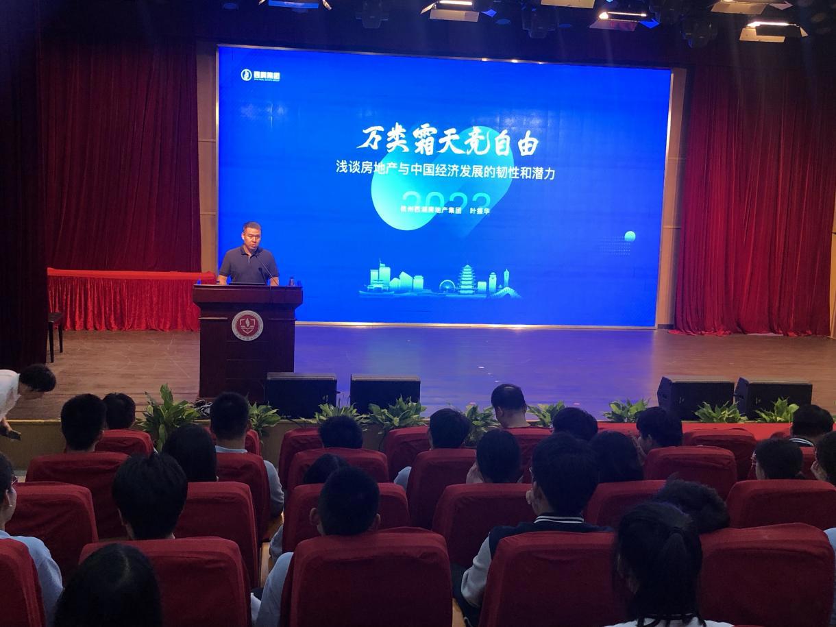 9月27日苏州外国语学校国际三部“苏外大讲堂”迎来本学期第一次开讲来宾——杭州西湖房地产集团总裁叶振华先生。叶振华先生毕业于浙江大学工商管理专业,后前往加拿大渥太华大学土木工程专业进行深造,也曾在北京大学攻读工商管理硕士学位,同时叶爸爸也是国际高一的家长代表。叶振华先生以《房地产行业与中国经济发展的韧性和潜力》为主题,为国际高中师生们带了场精彩的演讲。