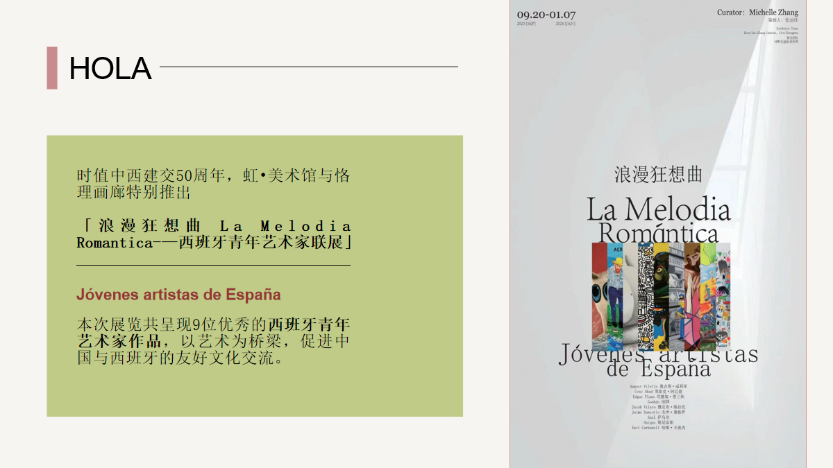 正值中西建交50周年,苏州外国语学校国际高中西语组的老师带领12名西语学生前往虹美术馆与恪理画廊参观「浪漫狂想曲 La Melodía Romántica—西班牙青年艺术家联展」。该美术馆展示了九位西班牙青年艺术家的代表作品,以艺术为桥梁呈现了多样且独特的西班牙浪漫风情。学生们在艺术的海洋里翱翔,聆听着讲解人员讲述每一个作品的深刻含义并和老师们进行了有趣的西班牙文化知识小互动。
