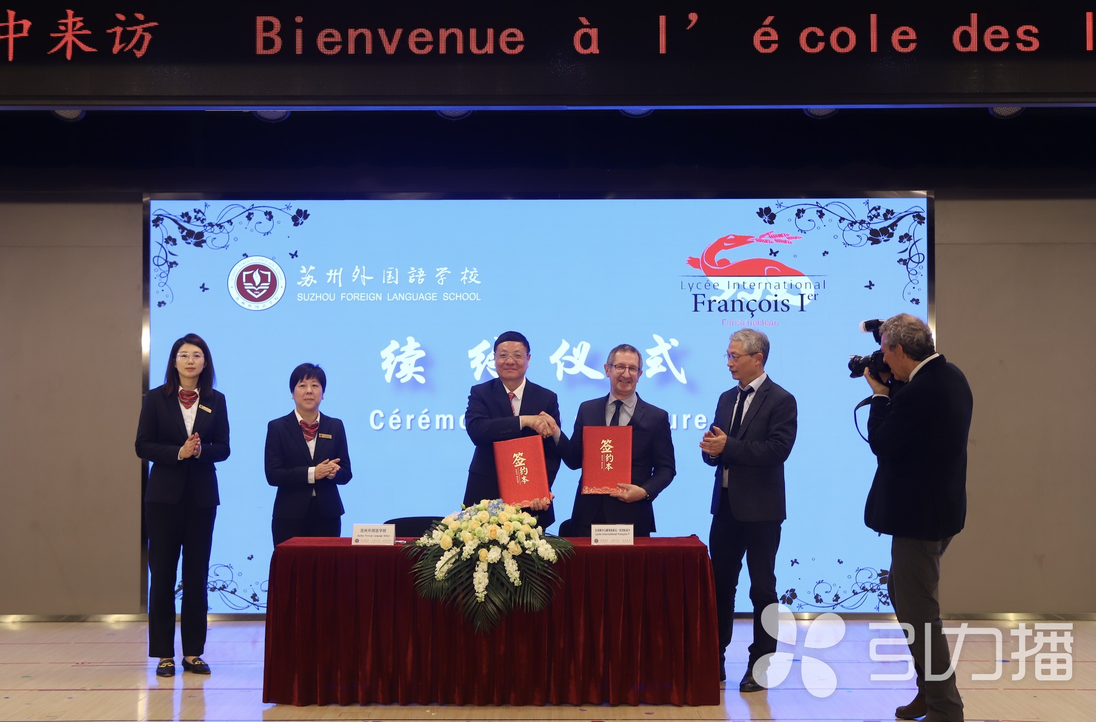 苏州外国语学校与法国弗朗索瓦一世国际高中双方校长签署续约协议并交换礼物。未来,双方将延续友好学校关系,不断推进双方的合作与友谊。