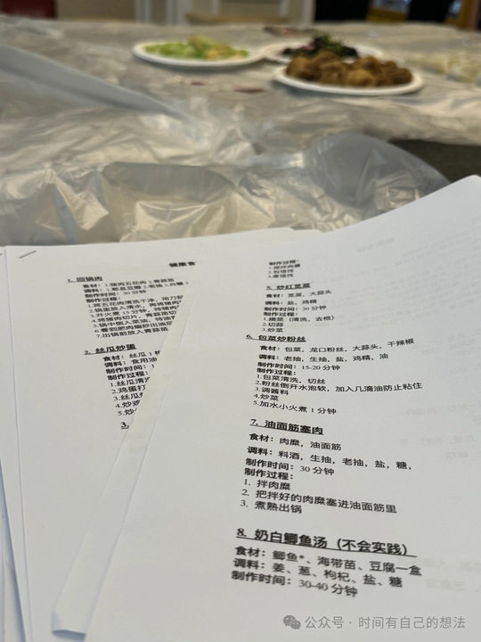 大家围坐在长桌旁,推荐着自己的健康菜谱,从材料,做法,到自己与菜品 的故事,影响。爷爷奶奶们似沉浸在烹饪的美妙过程中,说到兴起处,便手舞足 蹈,模拟起过程来。同学们虽没有丰富的做饭经验,但也在爷爷奶奶们一道道口 述的菜肴中感受老一辈烹饪的独家诀窍。“关火,出锅”,随着爷爷的谓叹,思绪 从幻想中琳琅满目的佳肴。