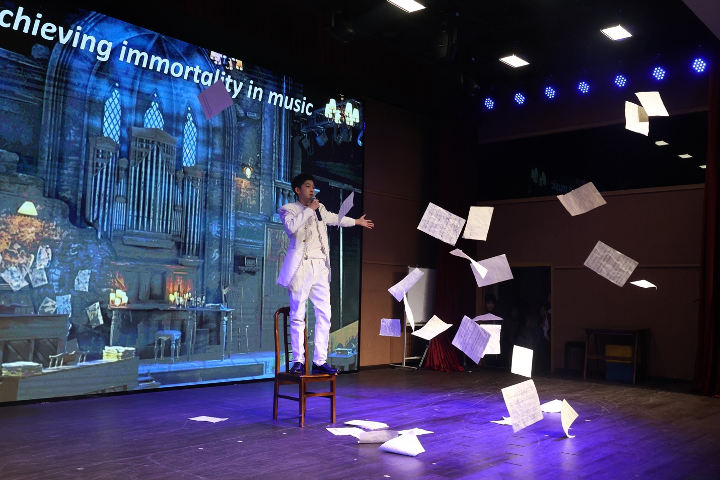 国际高二6班则为我们带来经典人物的传记故事,《莫扎特》。这是一个关于一位才华横溢的音乐家的故事。莫扎特有惊人的天赋。他追求梦想,渴望自由,但被误解和束缚。他经历了母亲的去世、家庭的破裂和阶级的不平等,但他也受到男爵夫人的启发,与命运作斗争,最终以牺牲生命为代价找到了纯粹的音乐。