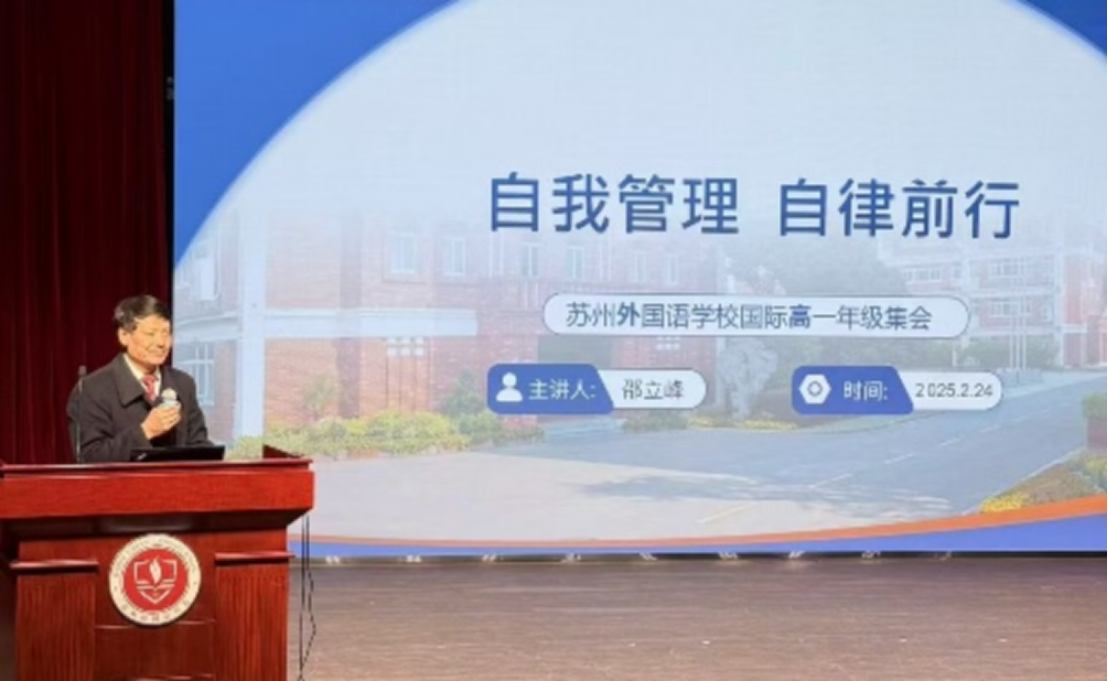 活动尾声,校长邵立峰从学子们的探索故事延伸,作《自我管理,自律前行》主题发言。他结合近期网络安全案例,强调“信息时代的自我保护力”:从社交平台定位设置到学术成果防抄袭技巧,从实验室操作规范到海外研学安全预案,用“100%的警惕守护1%的风险可能”。同时,提醒学生们注意日常行为礼仪规范,做文明苏外学生。