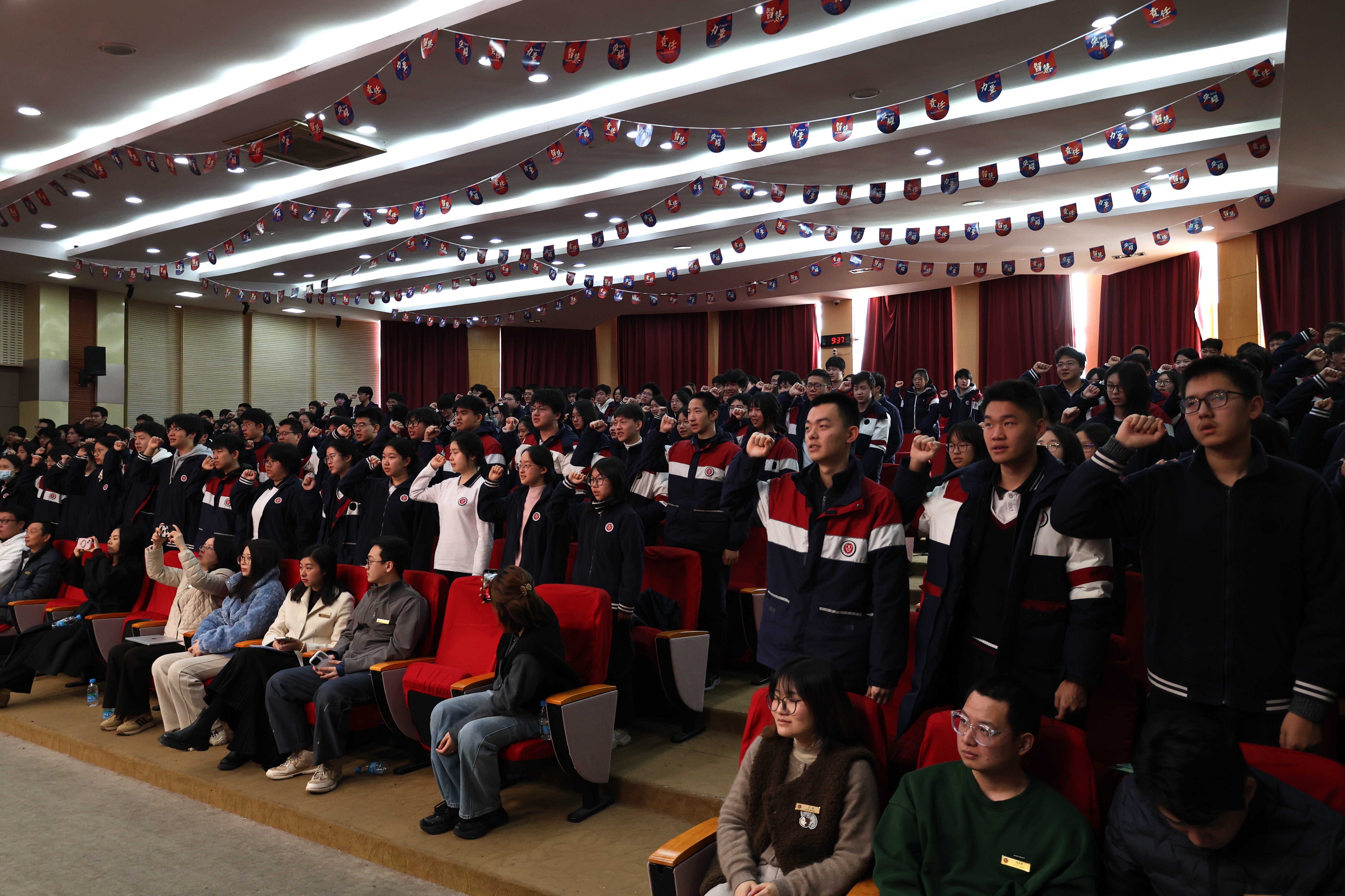 随后,在领誓人的带领下,全体同学高举右手,庄严宣誓。铿锵有力的誓言响彻会场,传达了同学们必胜的信念和决心。全体学生在横幅上郑重签名,许下承诺,为梦想而战。