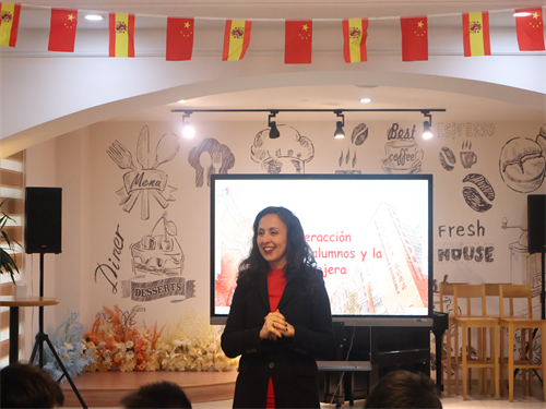 随后,参赞一行走进 “美好时光” 活动区,与初二 AC 西语班学生亲切互动。学生们用西班牙语进行问候和自我介绍,向来宾展示西语歌曲、诗歌朗诵和演讲展示。在学生与参赞女士互动提问时,现场氛围热烈融洽,充分展现了苏外学子的精神风貌。